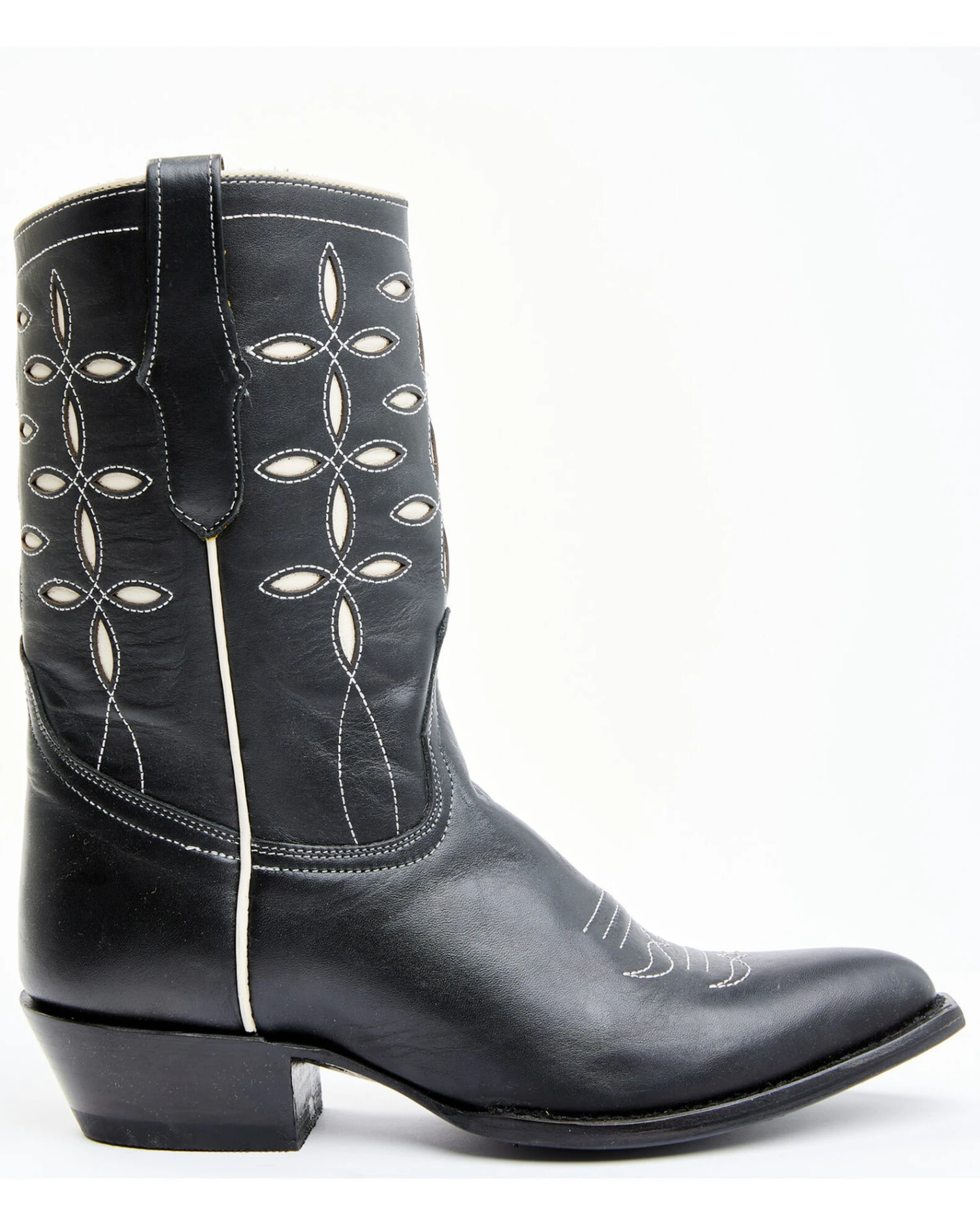 - Contrast white inlay and stitch detailing