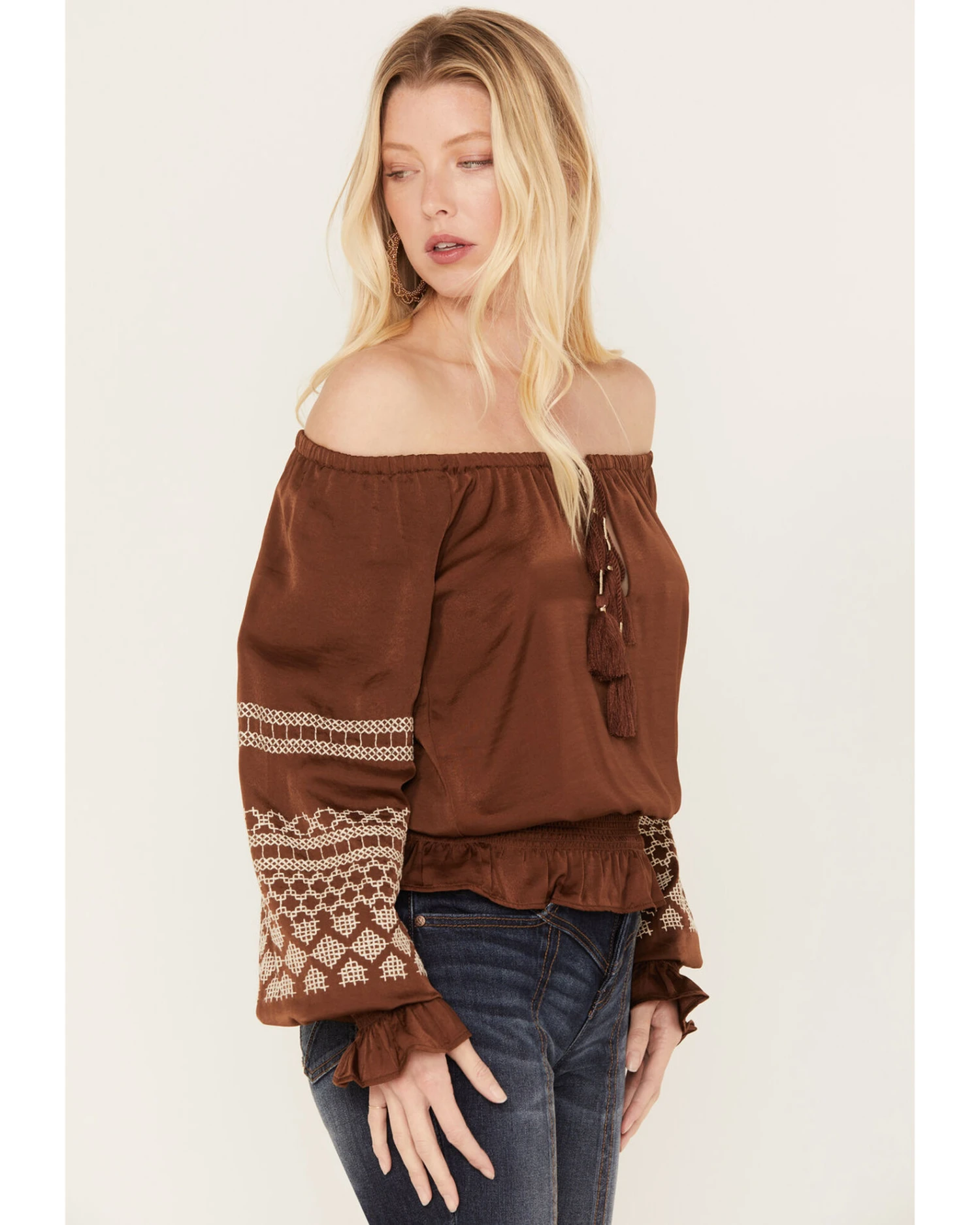 - Off the shoulder styling with tacked tie closure